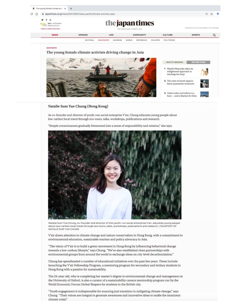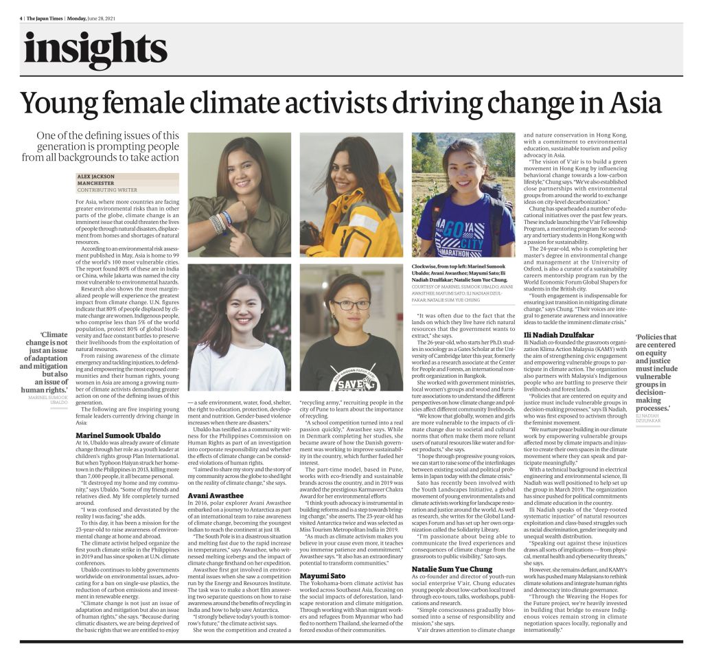 Honoured to be featured in The Japan Times 28 June’s print edition as one of the young female climate activists driving change in Asia, representing Hong Kong. It is deeply humbling to be listed with my friend and companion in the climate journey since COP25 – Marinel Ubaldo from the typhoon-prone Philippines, chairperson of Klima Action Malaysia Ili Nadiah Dzulfakar from Malaysia, polar explorer Avani Awasthee from India and forest conservation scholar Mayumi Sato from Japan.